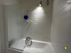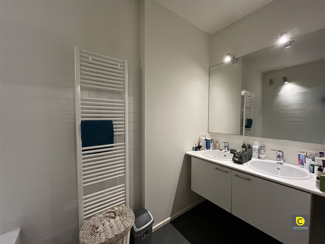 De badkamer omvat een ligbad met douchecombinatie, handdoekdroger en dubbele lavabo met bijhorend meubel en spiegelkast.