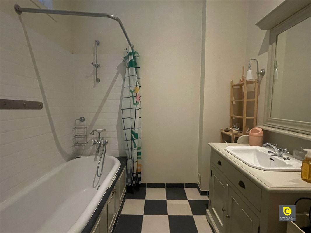 Wat meteen opvalt is de royale oppervlakte van de woonkamer, gecombineerd met het hoge plafond. Hier is meer dan voldoende plaats voor een gezellig salon en een grote eettafel. Het geheel ligt op een houten parketvloer.