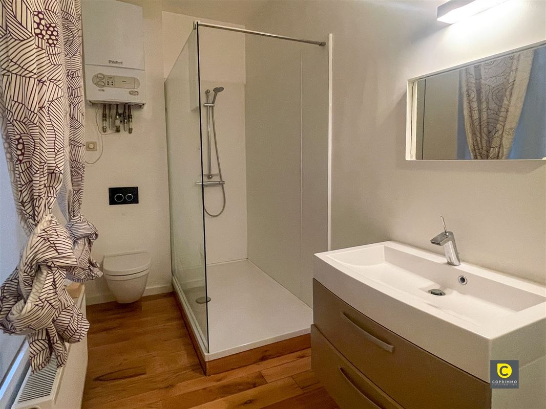De badkamer is uitgerust met een grote inloopdouche, toilet en een praktisch lavabomeubel met schuiven.