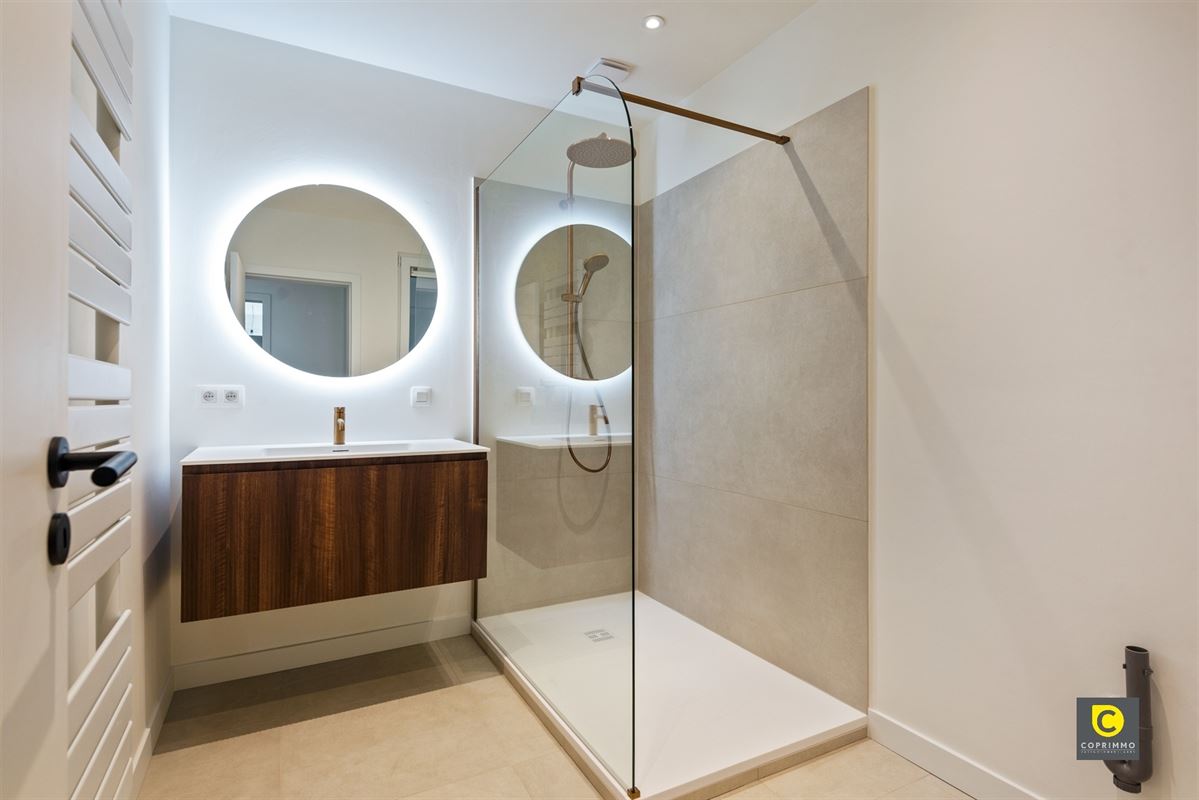 De lichtrijke leefruimte, dankzij de grote raampartijen, sluit mooi aan op de open keuken. Deze is volledig uitgerust en biedt directe toegang tot het aangename terras.