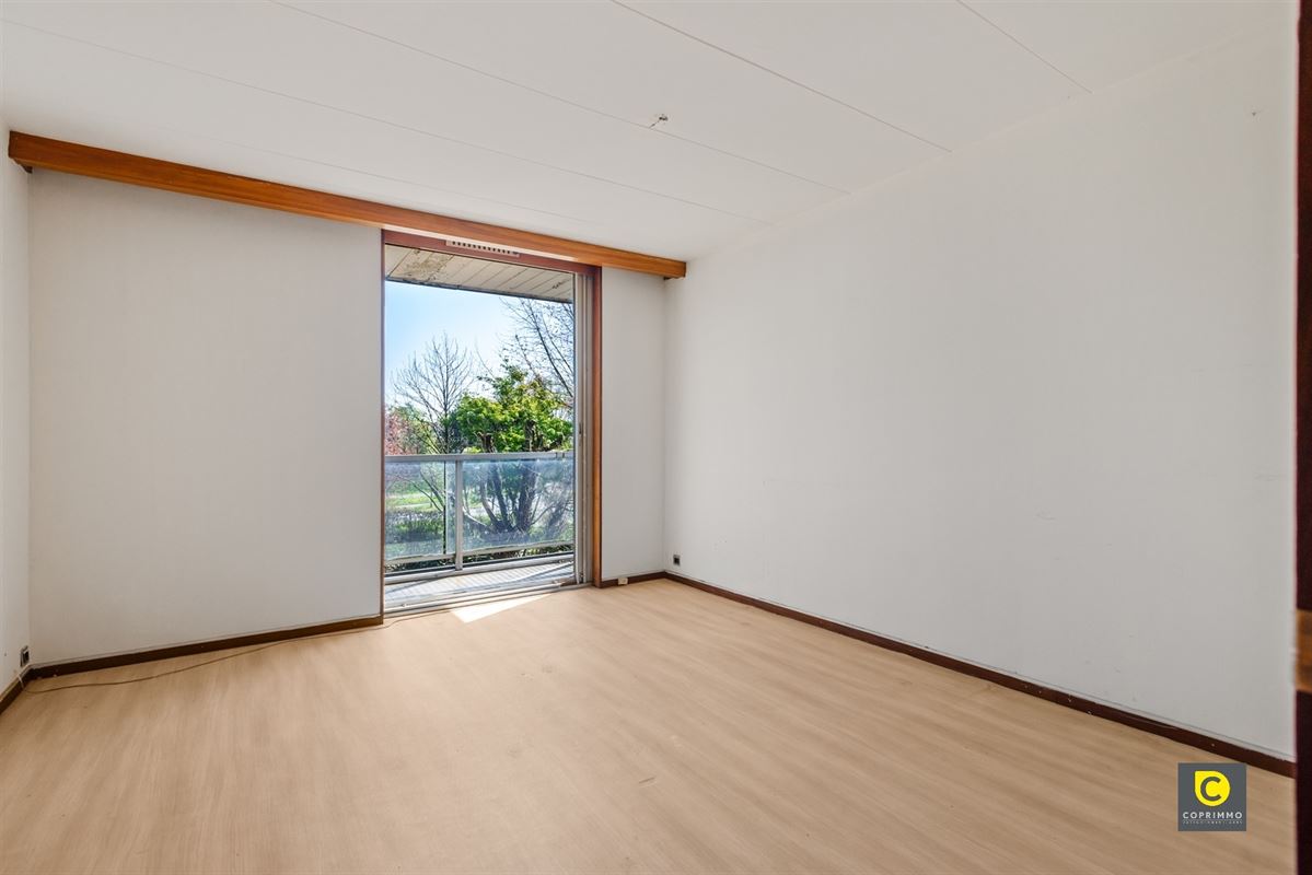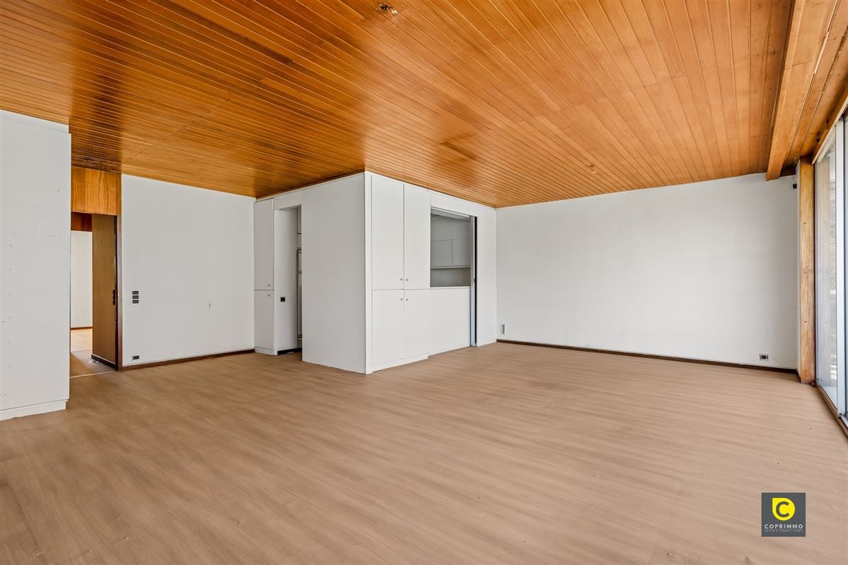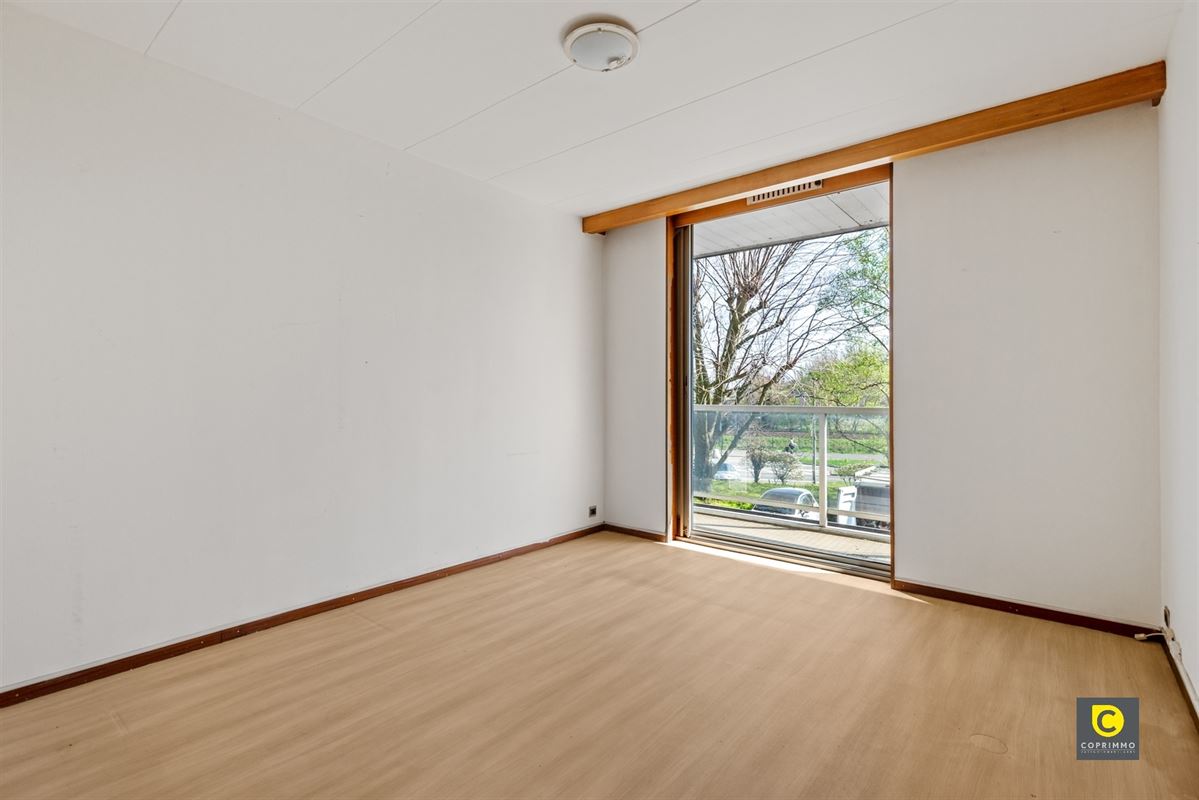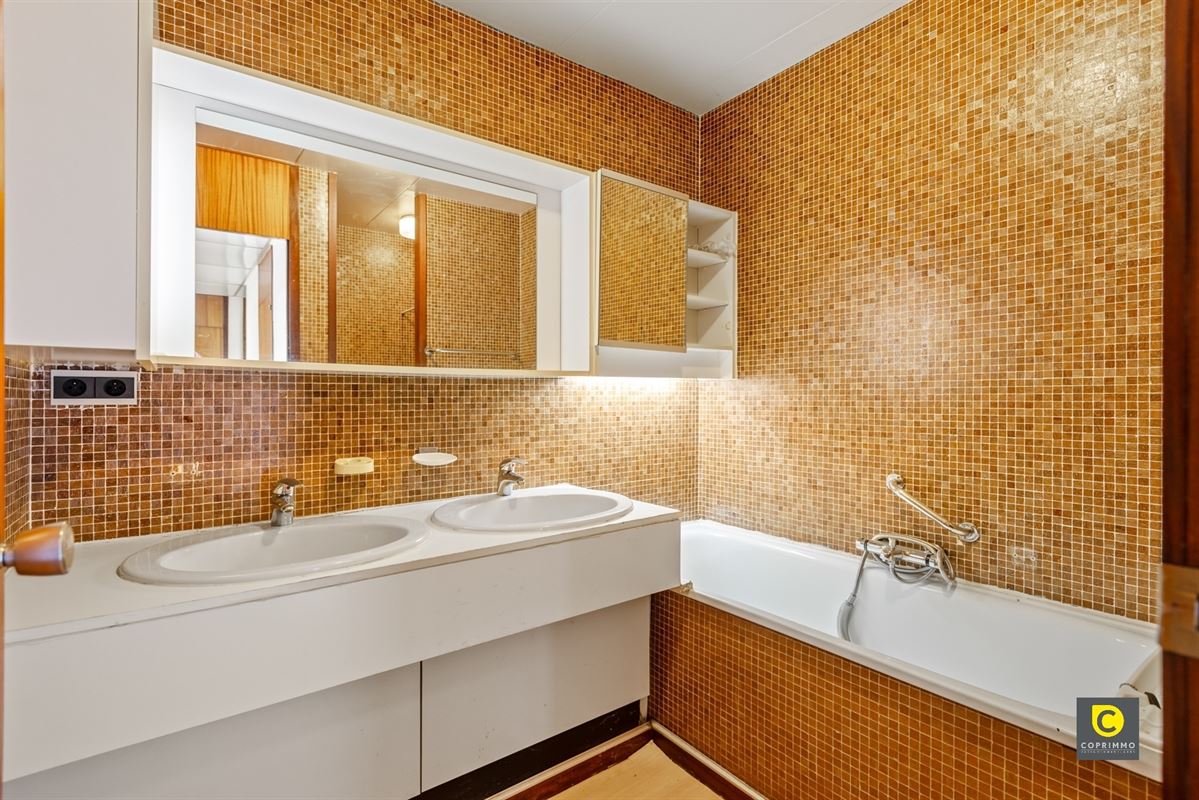 U komt het appartement binnen via de inkomhal met vestiaire en videofoon. De leefruimte baadt in het natuurlijk licht, kijkt uit op het groen en kan in de zomermaanden worden omgetoverd tot uitbreiding van het terras. De half-open keuken is mooi geïntegreerd in de leefruimte en biedt vele en leuke mogelijkheden voor een toekomstgerichte renovatie. Ze voorziet in veel werk- en opbergruimte en is uitgerust met een keramisch vuur, dampkap, oven, vaatwasser, koelkast, vriezer en lavabo.