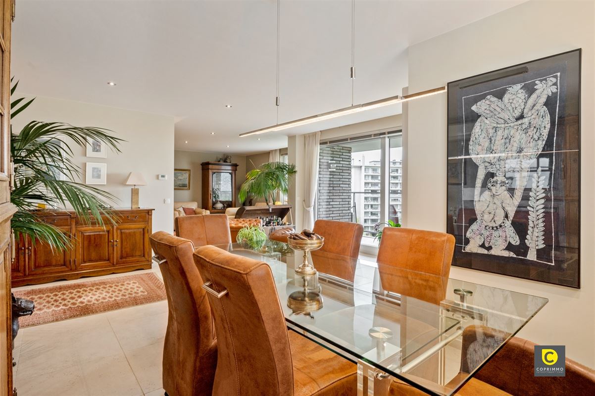 U komt het appartement binnen via de inkomhal die voorzien is van een veiligheidsdeur en videofoon. In de hal vinden we naast een apart toilet ook nog een handige bergruimte met aansluiting voor een wasmachine en droogkast. Vanuit de inkomhal wandelt u door in de ruime leefruimte (ca. 50 m²) die een leuke indeling heeft waardoor u beschikt over een apart salon en aparte eetkamer. Bovendien geniet u van een mooie natuurlijk lichtinval en een adembenemend uitzicht over de Antwerpse skyline. Voor nog wat extra sfeer en gezelligheid kan u gebruik maken van de bio-ethanol haard. Daarnaast is er nog een airco aanwezig. De keuken werd voorzien van alle moderne toestellen.