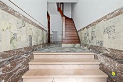 Bij het binnenkomen in het gebouw springt de inkomhal onmiddellijk in het oog dankzij de prachtige mid-century traphal met marmeren afwerking. Eenmaal binnen in het appartement komt u in de ruime inkomhal, afgewerkt met een grijze tegelvloer, die alle ruimtes met elkaar verbindt.