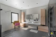 De badkamer is eveneens royaal in omvang, voorzien van een dubbel lavabomeubel, een inloopdouche en een toilet.