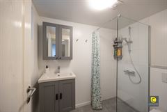 De badkamer is afgewerkt met hoogwaardige materialen en beschikt over een moderne inbouwkast, een wastafel met dubbele lavabo, een ruime inloopdouche met glazen wand en een toilet.