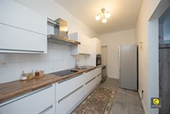 Aansluitend bevindt zich de moderne, volledig uitgeruste keuken met kwalitatieve toestellen, waaronder een vaatwasser en afzuigkap. De combinatie van houten werkbladen en witte kasten geeft de keuken een strak en hedendaags karakter.