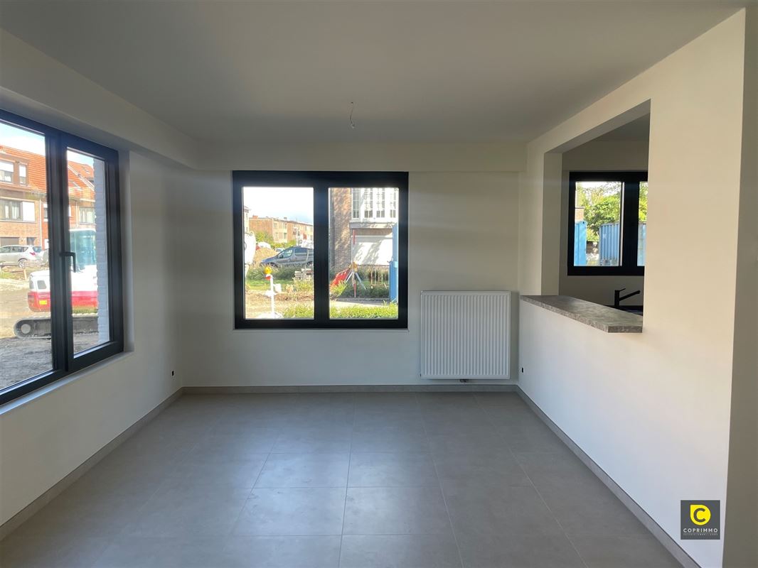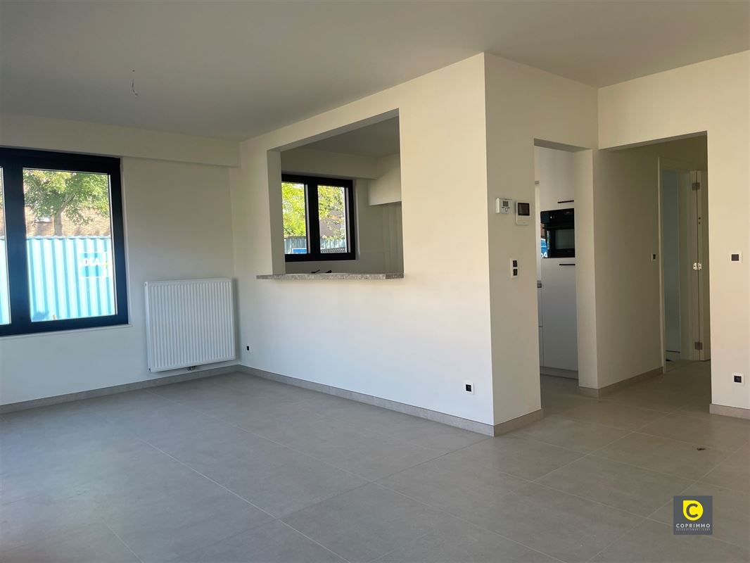De leefruimte bevindt zich vooraan het appartement en is voorzien van een tegelvloer. Dankzij de vele ramen komt er veel natuurlijk licht binnen. De open keuken is voorzien van alle comfort: vaatwasser, koelkast, oven,…..