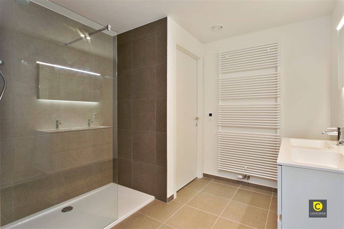 De moderne badkamer omvat een grote inloopdouche, handdoekradiator en dubbele lavabo met bijhorend meubel.