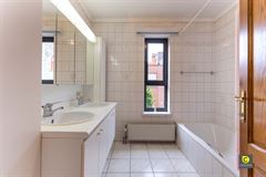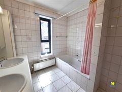 De badkamer is voorzien van een lavabo meubel en een ligbad en is volledig betegeld.