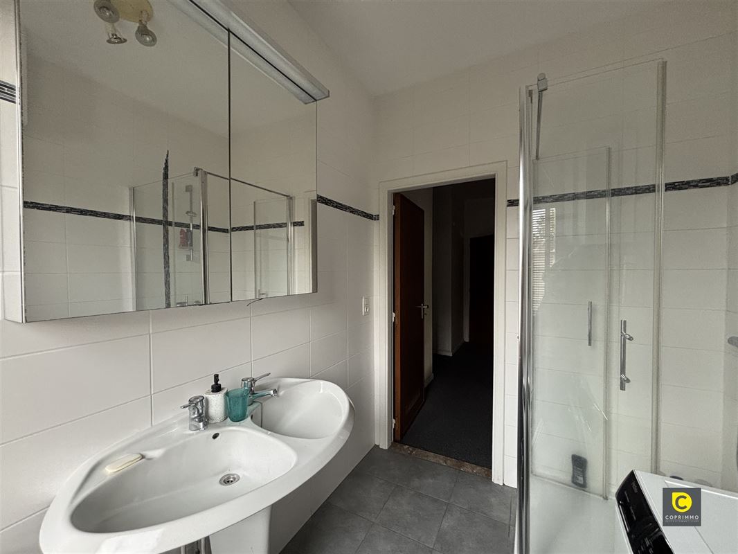 De badkamer is voorzien van een dubbele lavabo en een douche