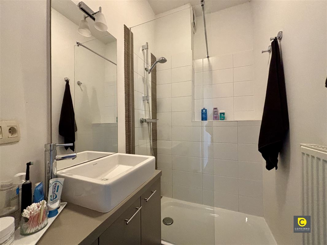 De badkamer is compact maar uiterst praktisch ingericht, met een douche, lavabo.