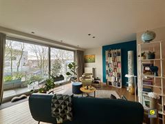 De gezellige woonkamer geniet van een overvloed aan natuurlijk licht dankzij de grote schuiframen aan de voorzijde. De ruimte biedt meer dan voldoende plaats voor zowel een stijlvol salon als een aangename eetruimte.
