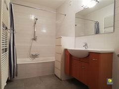 De badkamer is uitgerust met een ligbad met douchecombinatie, handdoekradiator en een lavabomeubel.