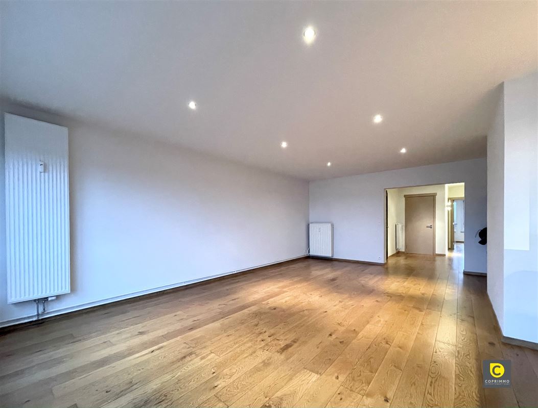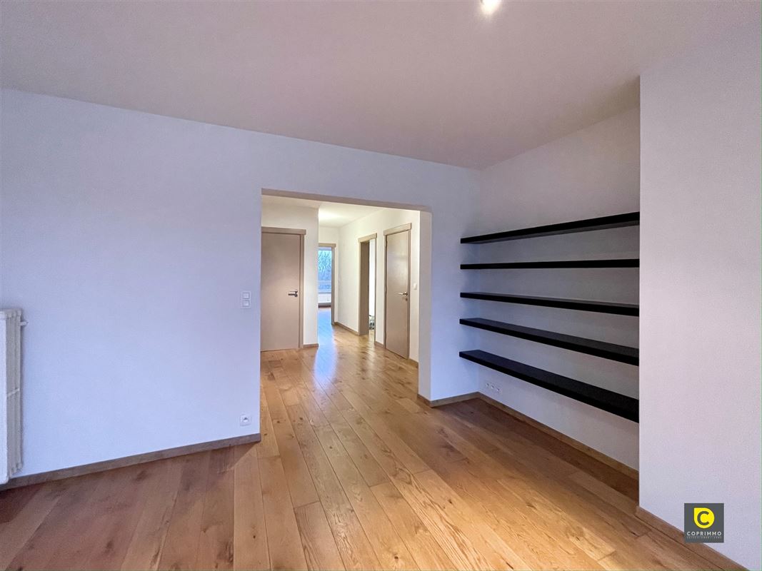 De leefruimte op parket geniet van veel natuurlijk lichtinval met rechtstreekse toegang naar de open keuken.