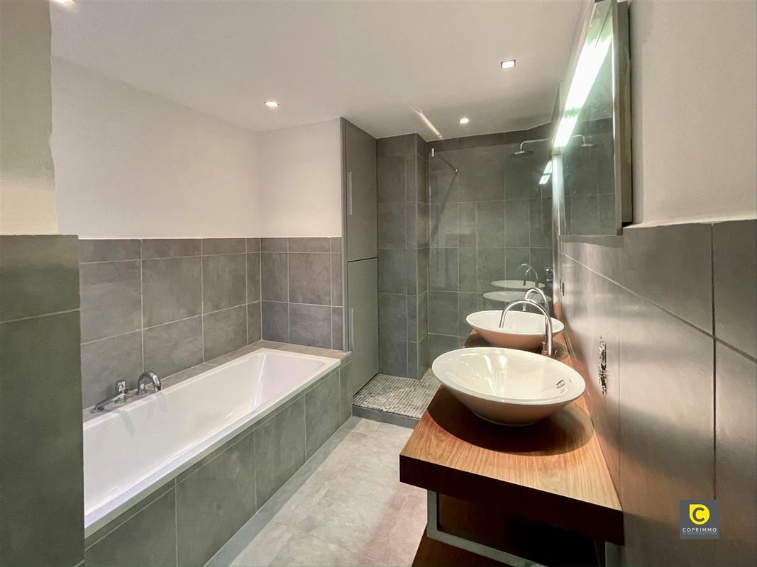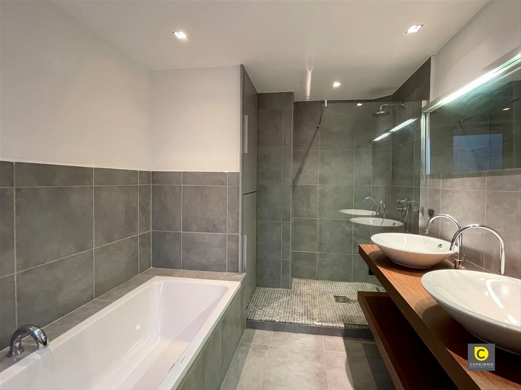 De badkamer is recent gerenoveerd en beschikt over een ligbad, inloop douche en dubbel lavabo meubel.
