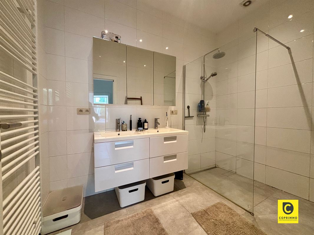 De moderne badkamer heeft een ruime inloopdouche en dubbele lavabo.