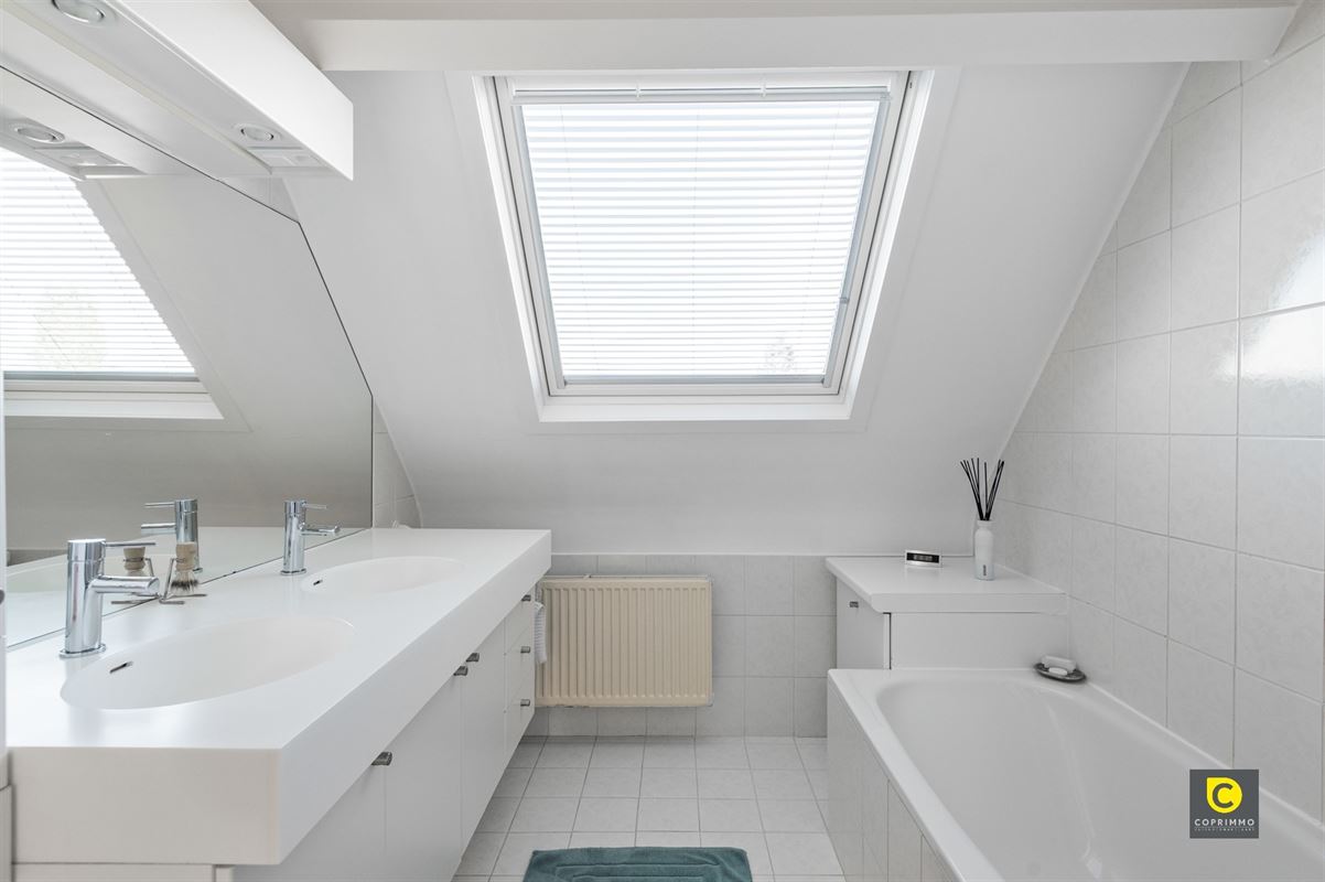 De mooie houten trap brengt je naar de eerste verdieping, waar je meteen wordt verwelkomd in een gezellige lichte leefruimte. In de L-vormige woonkamer kan je gezellig ontspannen voor de televisie. Achteraan bevindt zich de eetkamer naast de keuken met zicht op de groene tuin. De keuken is momenteel afgesloten van de eetkamer maar kan met een kleine ingreep open gemaakt worden (oorspronkelijk was deze open). In de keuken vindt u alles wat u nodig heeft. Een koelkast, vaatwasser, Combi-oven. Deze toestellen zijn recent (5j) vernieuwd. Ook nog een dampkap en keramische kookplaat zijn aanwezig.