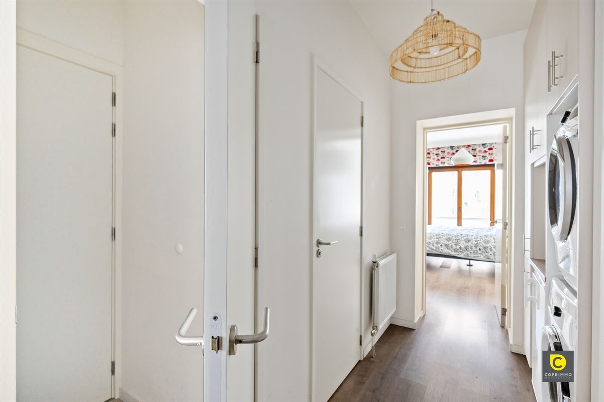Bij het betreden van het appartement komt u in een nette inkomhal met een gastentoilet en praktische ingemaakte kasten, waarin ook aansluitingen voor wasmachine en droogkast discreet zijn weggewerkt.