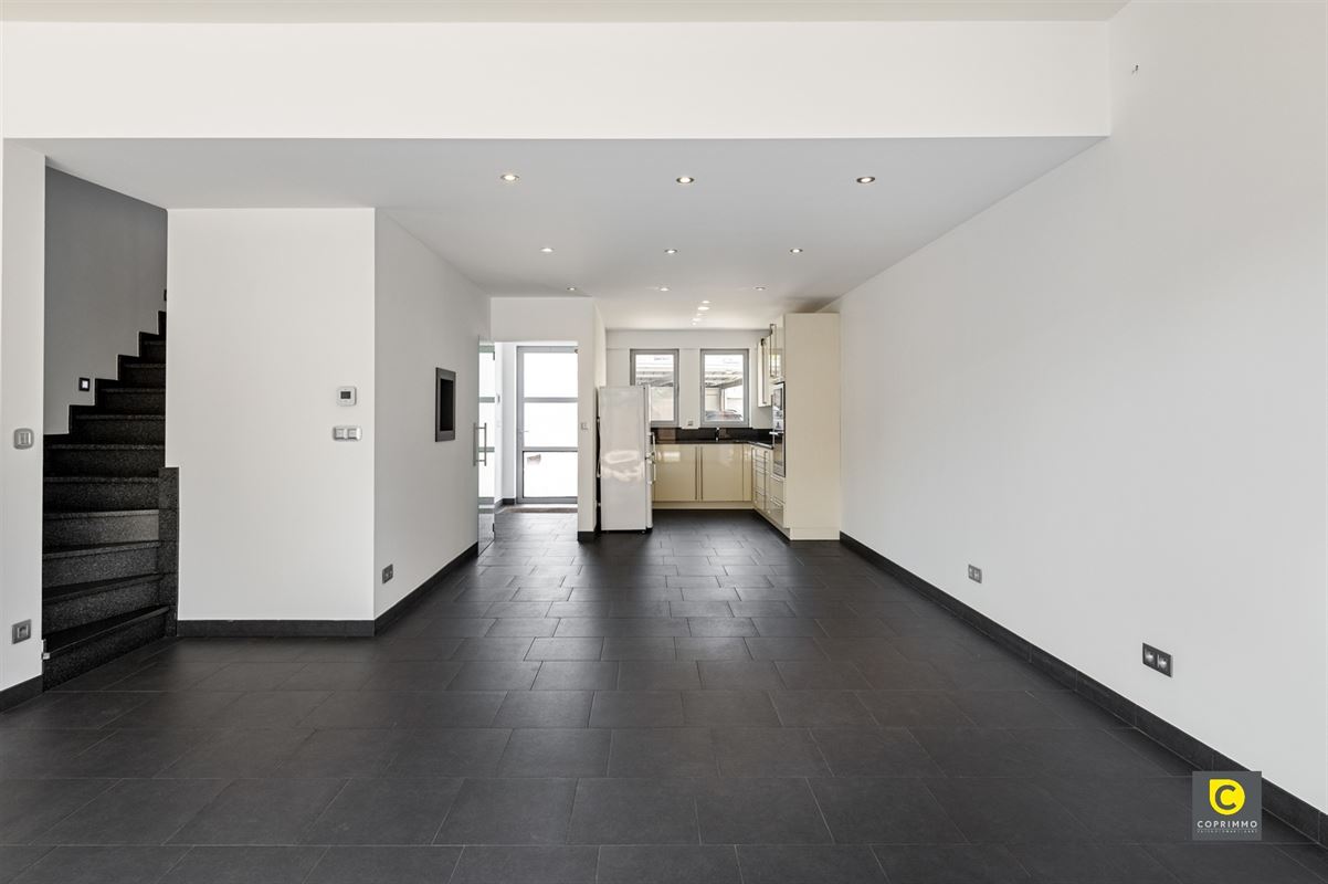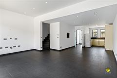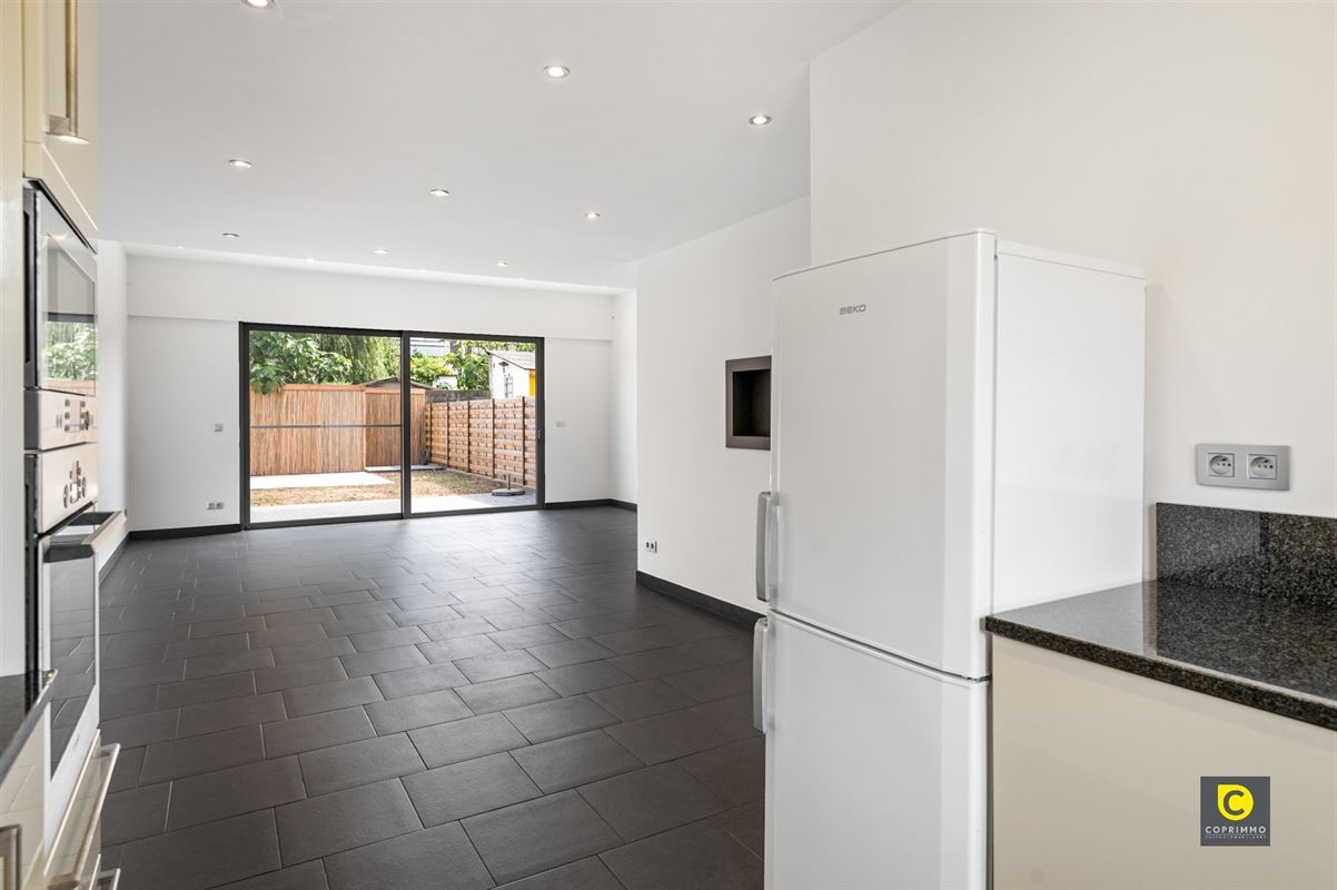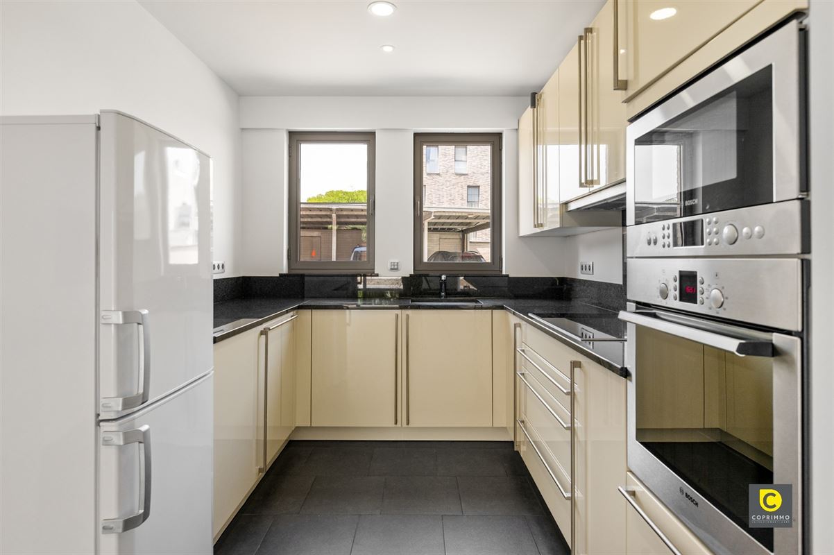 De lichte en gezellige leefruimte geniet van een overvloed aan natuurlijk daglicht dankzij de grote raampartijen en biedt een mooi zicht op de tuin. Aansluitend ligt de volledig ingerichte keuken, die voorzien is van alle hedendaagse comfort. U beschikt hier over een koelkast-diepvriescombinatie, een inductiekookplaat met dampkap, een ingebouwde oven en microgolfoven, een spoelbak en een vaatwasser. Deze ruimte vormt het hart van de woning, waar koken en gezellig samenzijn hand in hand gaan.