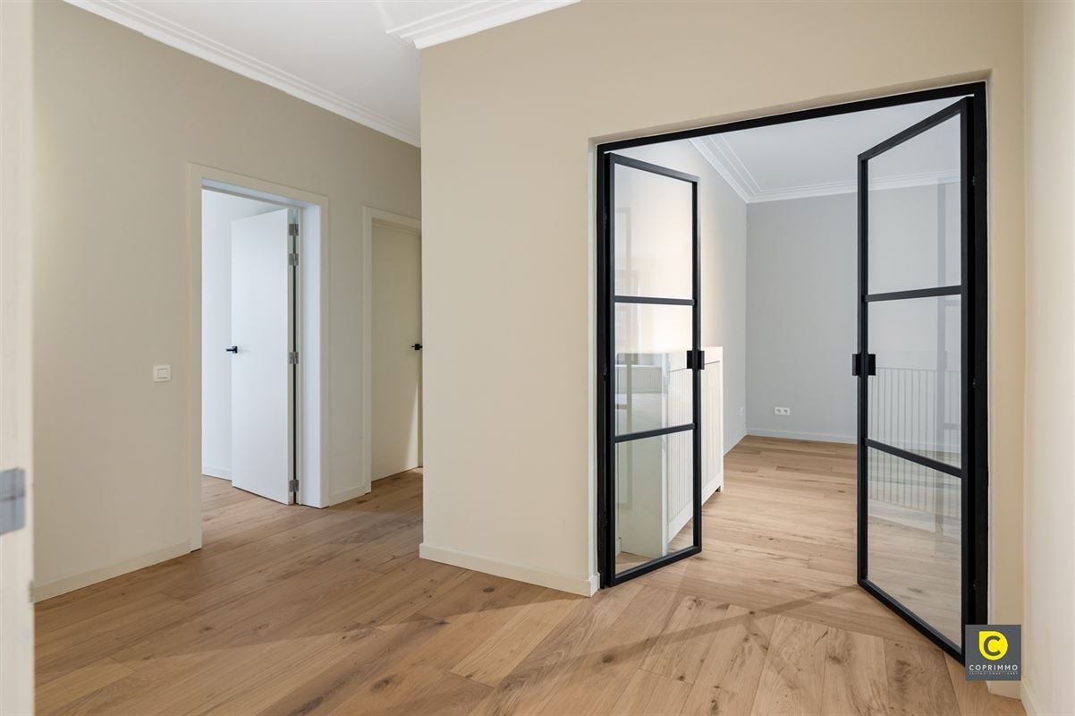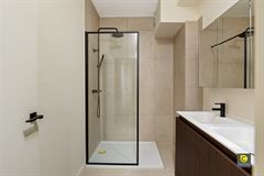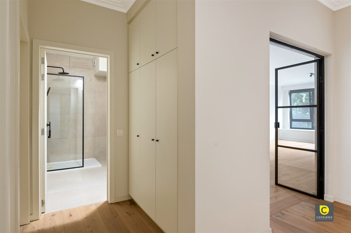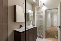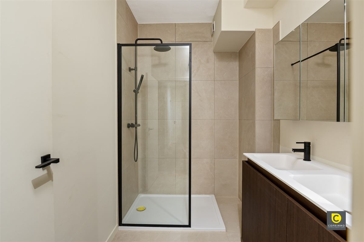 De inkomhal biedt tevens toegang tot een aparte gastentoilet en een ingemaakte kast, waardoor functionaliteit en comfort perfect worden gecombineerd. De moderne, strak afgewerkte badkamer is voorzien van een inloopdouche en een dubbele lavabo, uitgevoerd in hoogwaardige materialen die een luxe uitstraling geven.