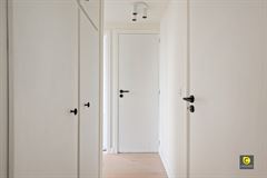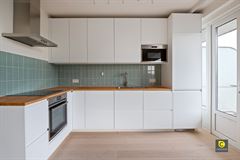 U betreedt het appartement via de inkomhal voorzien van een praktische vestiairekast. De lichte leefruimte biedt ruimte voor een gezellige zithoek en eethoek en geeft via grote raampartijen toegang tot het brede terras dat over de volledige breedte van het appartement loopt en veel zonlicht biedt. De open keuken is volledig uitgerust met moderne toestellen, waaronder oven, ijskast, diepvriezer, vaatwasser, microgolf, inductiekookplaat en dampkap, en vormt een mooi verlengstuk van de leefruimte.