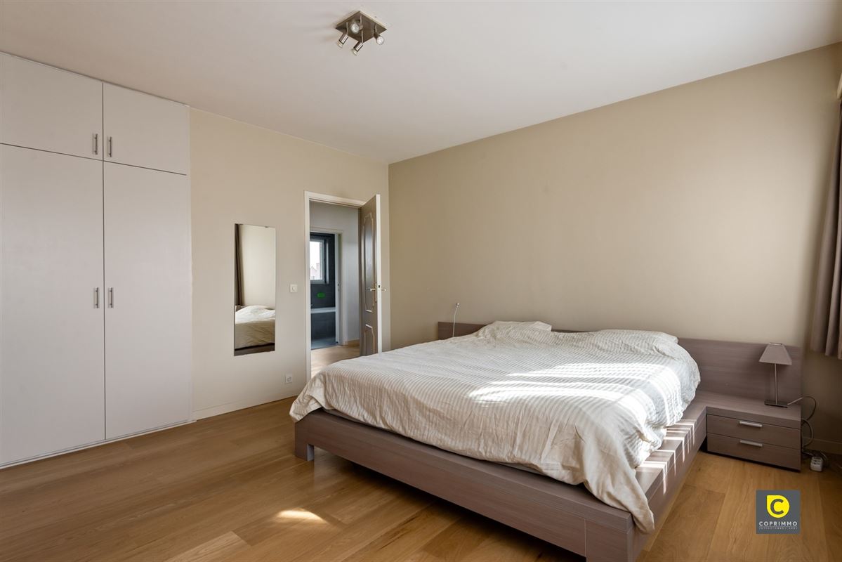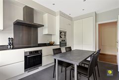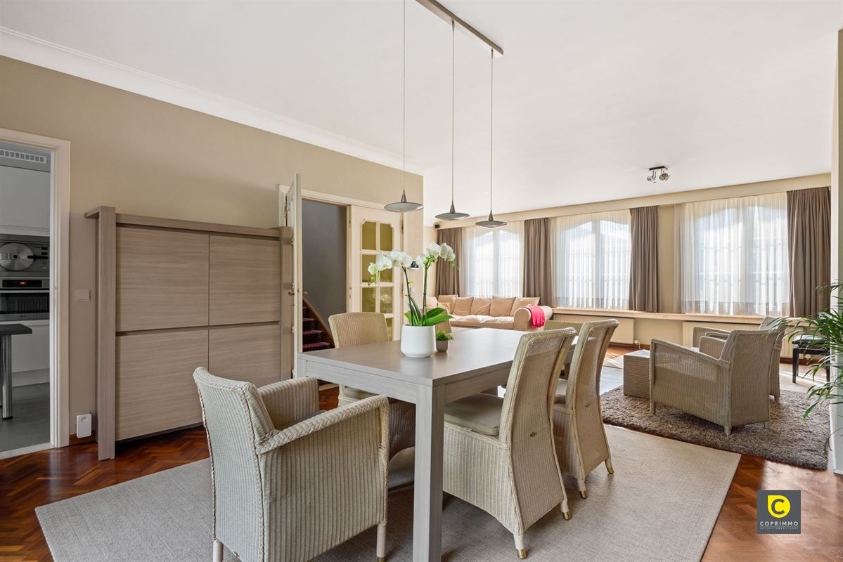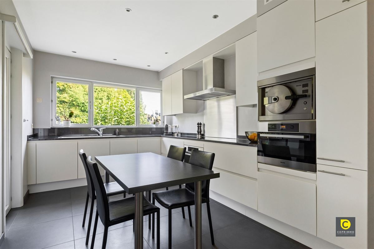De moderne, gesloten keuken is volledig uitgerust met hoogwaardige inbouwapparatuur en een elegant werkblad, ideaal voor de kookliefhebber. De eetruimte grenst, net zoals de keuken, aan het overdekt terras dat voorzien is van een vaste trap naar de tuin.