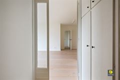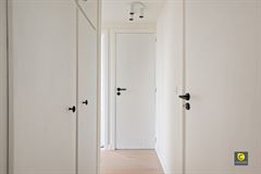 U betreedt het appartement via de inkomhal voorzien van een praktische vestiairekast. De lichte leefruimte biedt ruimte voor een gezellige zithoek en eethoek en geeft via grote raampartijen toegang tot het brede terras dat over de volledige breedte van het appartement loopt en veel zonlicht biedt. De open keuken is volledig uitgerust met moderne toestellen, waaronder oven, ijskast, diepvriezer, vaatwasser, microgolf, inductiekookplaat en dampkap, en vormt een mooi verlengstuk van de leefruimte.