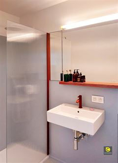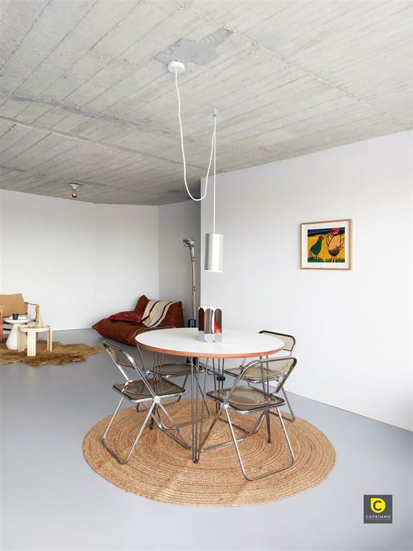 Het unieke karakter, het oog voor detail en de perfecte balans tussen materiaalgebruik en kleurenpalet worden meteen duidelijk bij het betreden van het appartement via de inkomhal met ingemaakte vestiaire, videofoon en extra bergruimte. De leefruimte en de keuken vormen een harmonieus geheel waarbij natuurlijke lichtinval en fenomenale vergezichten centraal staan. De hemelsblauwe gietvloer die u in heel het appartement kan terugvinden gaat hand in hand met het notelaren schrijnwerk, de alomtegenwoordige design verlichting en het industriële plafond. Het op maat gemaakte meubel tussen keuken en leefruimte omvat een zitgedeelte alsook veel opbergruimte langs beide kanten, een waar pronkstuk dat het hart van de woning vormt. De oogstrelende keuken voorziet bovendien in veel werkruimte en kwalitatieve toestellen (inductievuur, dampkap, oven, koelkast, vriezer, vaatwasser).