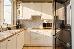 U betreedt het appartement via een praktische inkomhal met ruimte voor een vestiairekast, handig voor jassen en extra opbergruimte. De leefruimte is aangenaam en lichtrijk dankzij de hoge ligging en de grote raampartijen. Vanuit hier heeft u directe toegang tot het indrukwekkende terras, wat het appartement een open en ruim gevoel geeft. De aparte keuken beschikt over een spoelbak, kookplaat en dampkap en biedt bovendien veel kastruimte. Een praktische indeling met voldoende werk- en opbergruimte.