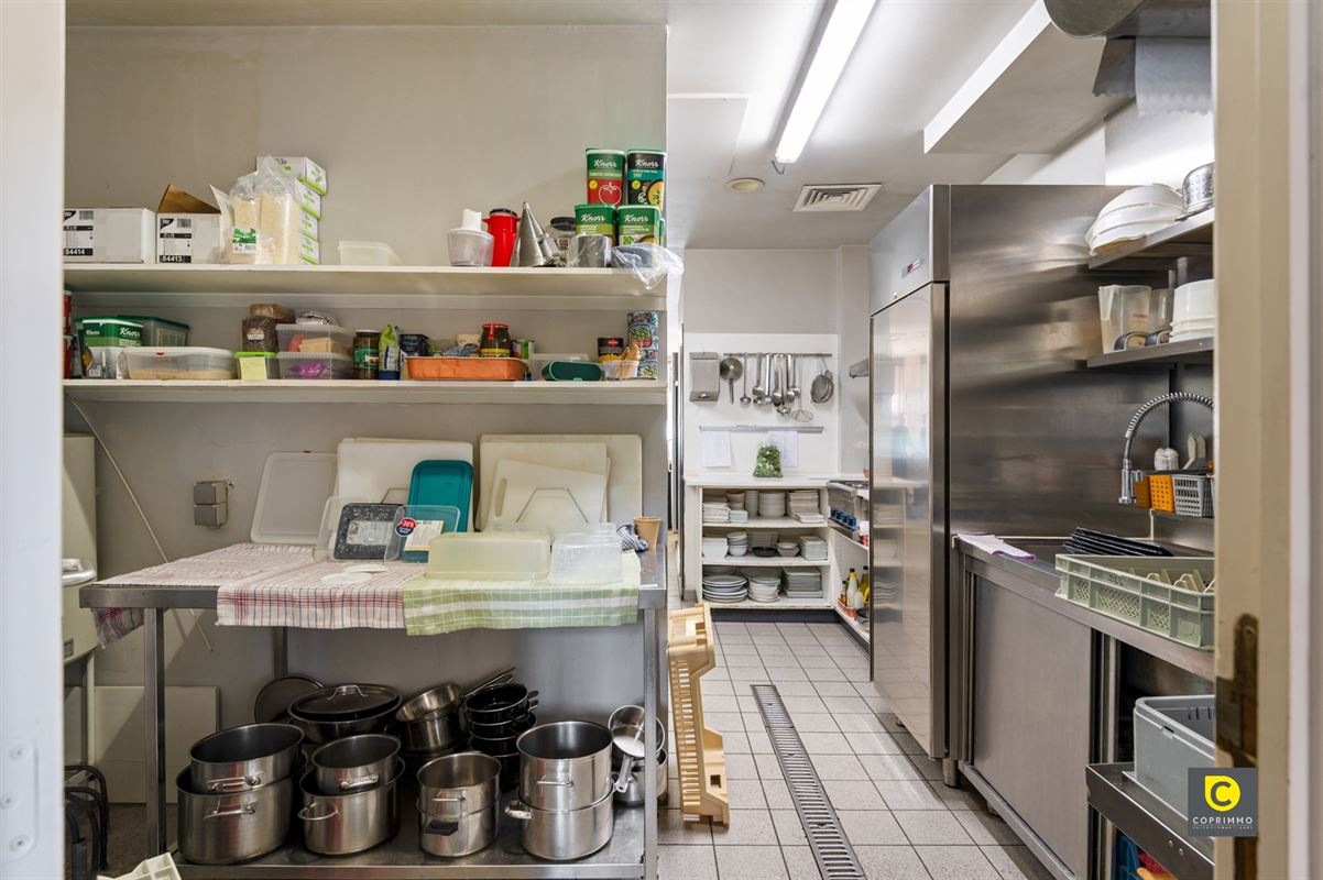 Het gelijkvloers omvat een verbruiksruimte met toog en zitgedeelte, een ingerichte keuken en een sanitaire blok. De ruimte is vandaag ingericht als traiteur / broodjeszaak, maar biedt tal van mogelijkheden voor andere doeleinden zoals kantoor, winkelruimte of showroom.